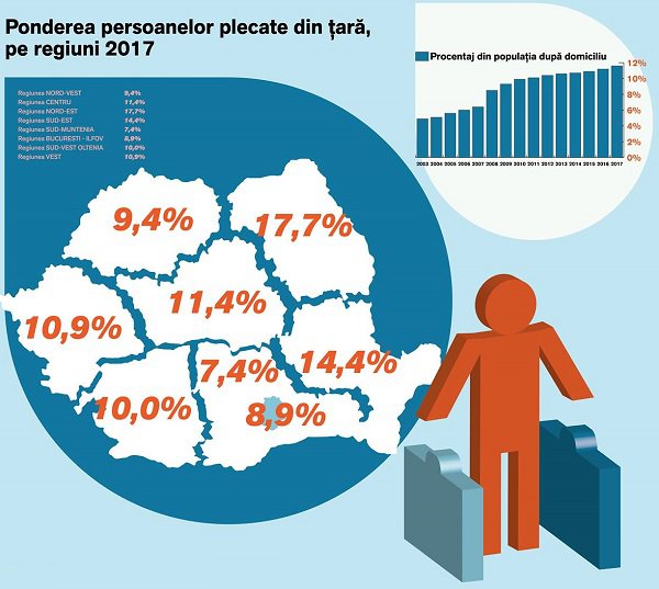 17,7% dintre moldoveni au părăsit ţara, pe locul doi în topul plecărilor fiind românii din Dobrogea (14,4%), urmaţi de cei din estul Transilvaniei (11,4%). La polul opus se situează zona Bucureşti – Ilfov, de unde doar 8,9% dintre cetăţenii cu domiciliu stabil au decis să plece peste hotare.