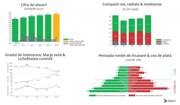 Risc ceva mai scăzut din acest punct de vedere prezintă companiile din sectorul cultură&divertisment, unde perioada de încasare a creanţelor este de 51 de zile, sănătate & asistenţă socială (56 zile), hoteluri & restaurante (59 zile). Vestea bună este că, cel puţin la nivelul anului 2017, plăţile restante pe ansamblul economiei au scăzut cu 17,6% comparativ cu 2016, ajungând la 20 miliarde euro, iar gradul de îndatorare s-a redus la 53,7%. Privind pe ansamblul ultimilor 5 ani, din 2013 şi până în prezent, comerţul continuă să reprezinte cel mai riscant domeniu în ceea ce priveşte întârzierile la plată. „Este domeniul cel mai volatil privind din prisma relaţiilor de business şi a dinamicii înfiinţării şi închiderii firmelor. În plus, în acest sector, creditul furnizor se află în prim-plan, cu consecinţele lui negative, judecând din prisma dinamicii achitării angajamentelor de plată”, au mai spus analiştii de la KeysFin. De notat că în acest sector activează şi cele mai multe companii, aproape 200.000, acestea înregistrând anul trecut o cifră de afaceri de peste 110 mld.euro.