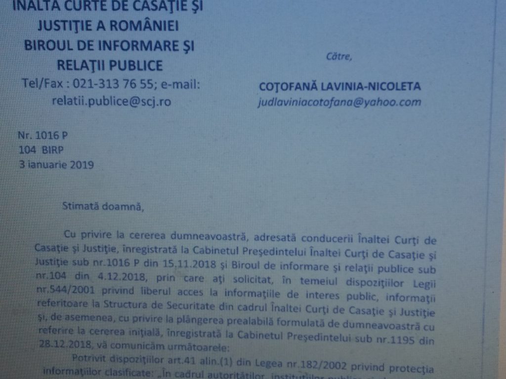 Subsemnata Lavinia-Nicoleta Coțofană, domiciliată în orașul____, față de adresa transmisă subsemnatei de către instituția a cărei președinte sunteți, sub nr. 1016 P 104 BIRP din 03 ianuarie 2019, sub semnătura magistratului-asistent Viorel Ciobanu în care se