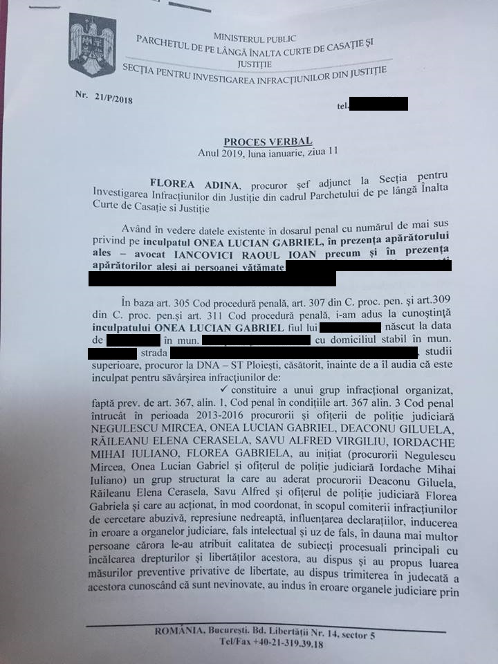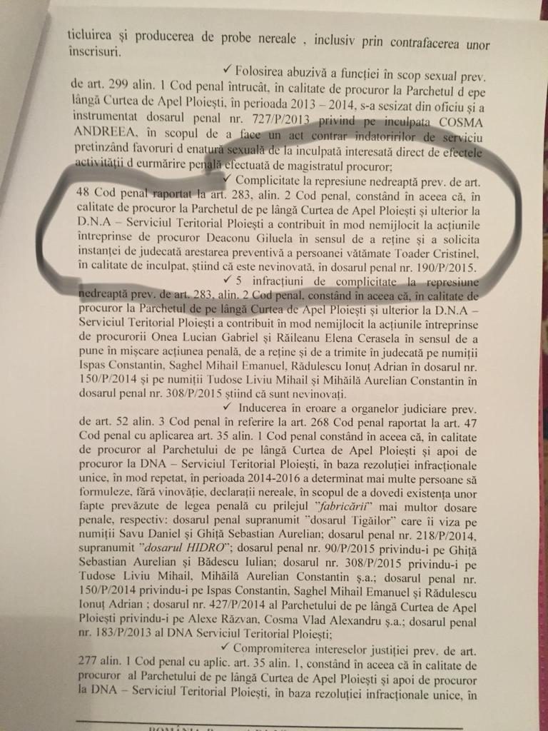 “Complicitate la represiune nedreapta prev. de art 48 Cod penal raportat la art 283, alin 2 Cod Penal, constand in aceea ca, in calitate de procurer la Parchetul de pe langa Curtea de Apel Ploiesti si ulterior in aceea ca, in calitate de procurer la DNA-ST Ploiesti a contribuit in mod nemijlocit la actiunile intreprinse de procurer Deaconu Giluela in sensul de a retine si a solicita instantei de judecata arestarea preventive a persoanei vatamate Toader Cristinel, in calitate de inculpat, stiind ca ESTE NEVINOVAT, in dosarul penal nr 190/P/2015”!