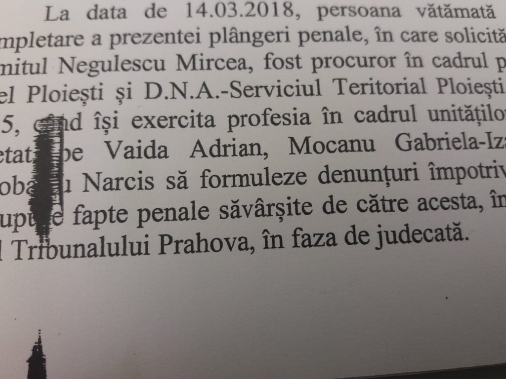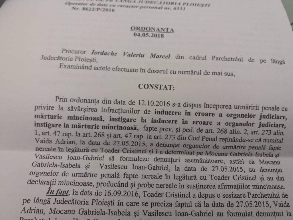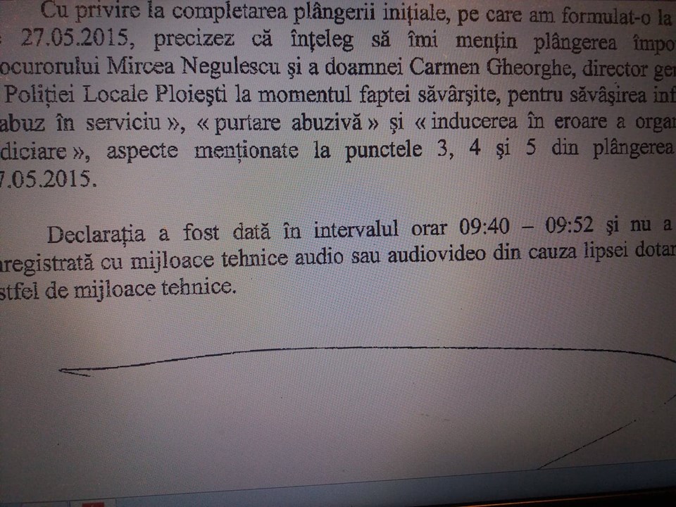 In dosarul nr 8519/105/2015 de pe rolul Tribunalului Prahova au fost obtinute date care confirma in totalitate dezvaluirile noastre privind implicarea procurorului Negulescu Mircea si al directorului general al Politiei Locale Ploiesti, Carmen Gheorghe, in fabricarea de probe si influentarea martorilor (prin presiuni) in scopul inlaturarii si condamnarii fostului director al acestei institutii, Toader Cristinel.