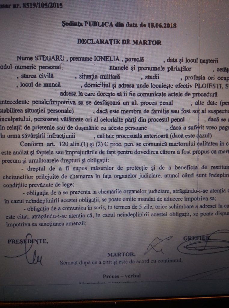 La audierea in fata completului de judecata a martorului Stegaru Ionela, fost angajat al Politiei Locale Ploiesti au reiesit urmatoarele: