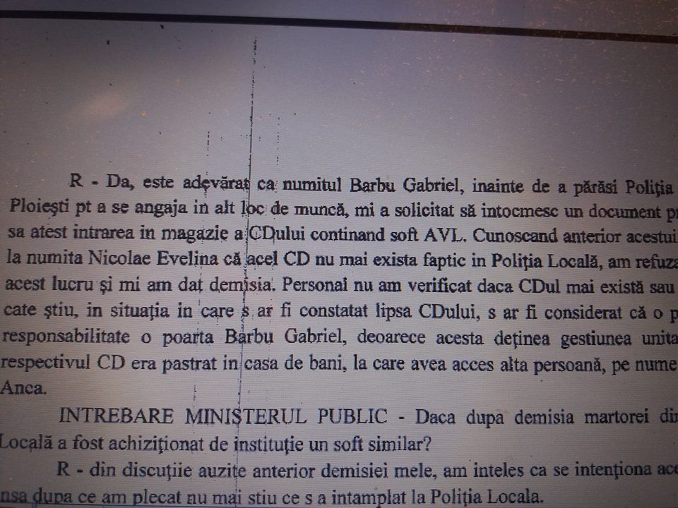 “Da, este adevarat ca numitul Barbu Gabriel, inainte de a parasi Politia Locala Ploiesti pentru a se angaja in alt loc de munca mi-a solicitat sa intocmesc un document prin care sa attest intrarea CD-ului continand soft AVL. Cunoscand anterior acestui fapt de la numita Nicolae Evelina ca acest CD nu mai exista faptic in Politia Locala, am refuzat sa fac acest lucru si mi-am dat demisia….”