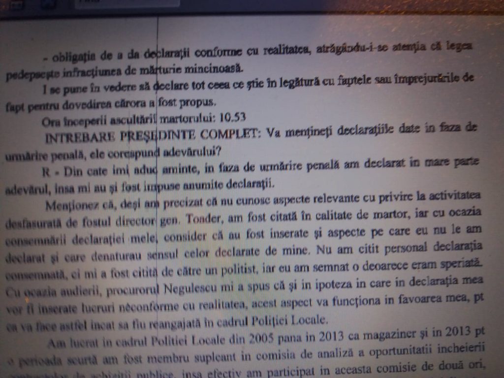 Raspuns martor Stegaru Ionela:…”Mentionez ca, desi am precizat ca nu cunosc aspecte relevante cu privire la activitatea desfasurata de fostul director general Toader, am fost citata in calitate de martor, iar cu ocazia consemnarii declaratiei mele, consider ca au fost inserate si aspecte pe care eu nu le-am declarat si care denaturau sensul celor declarate de mine. Nu am citit personal declaratia consemnata, ci mi-a fost citita de catre un politist, iar eu am semnat deoarece eram speriata. Cu ocazia audierii, procurorul Negulescu mi-a spus ca si in ipoteza in care in declaratia mea vor fi inserate lucruri neconforme cu realitatea, acest aspect va functiona in favoarea mea, pentru ca va face astfel incat sa fiu reangajata in cadrul Politiei Locale …”