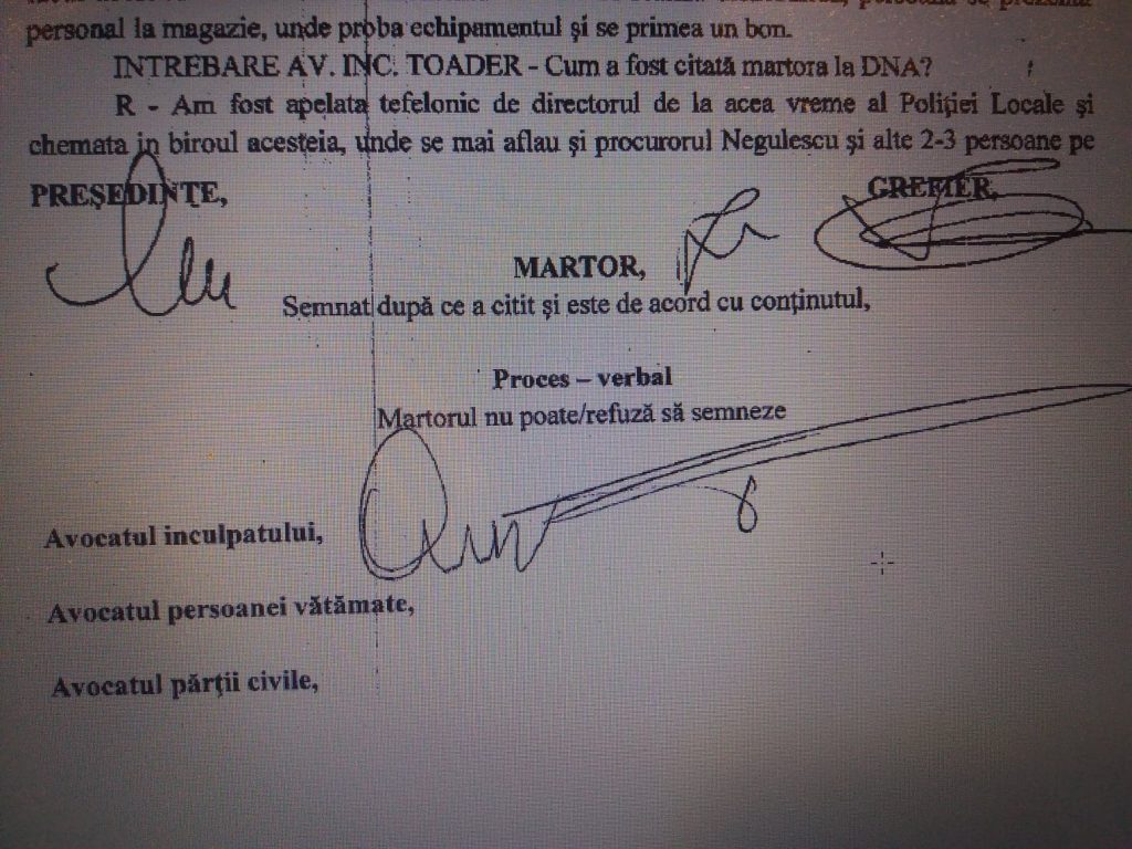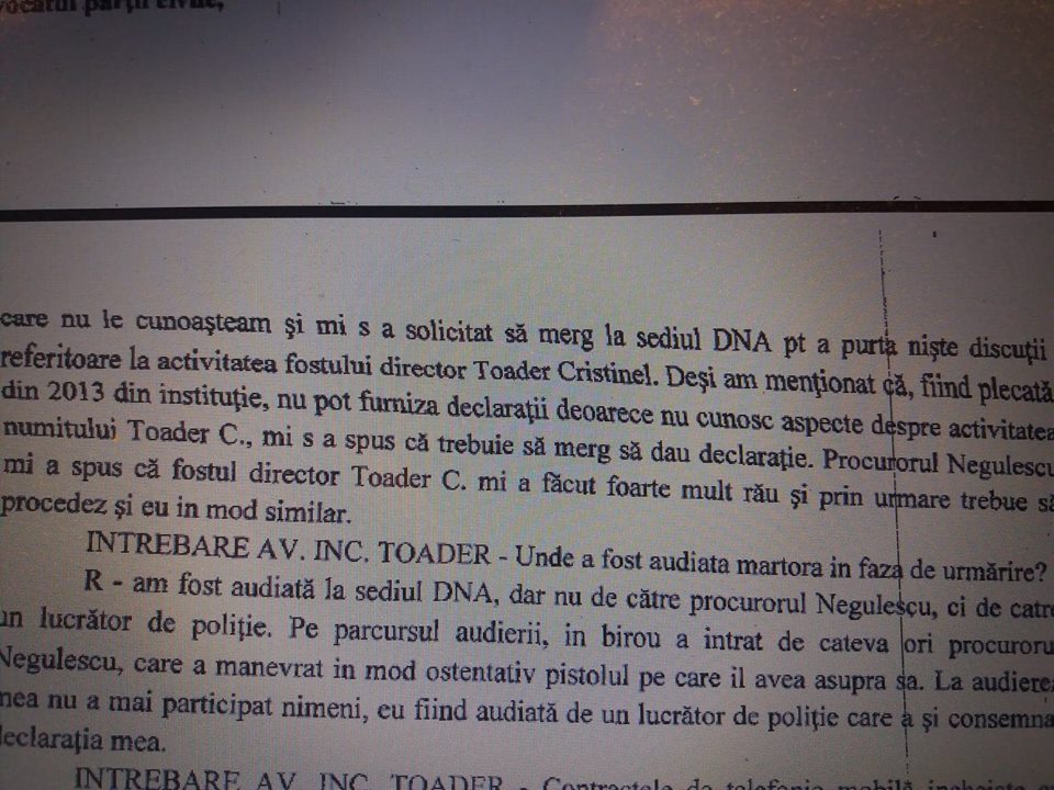 Raspuns martor Stegaru Ionela: – Am fost apalata telefonic de directorul de la aceea vreme a Politiei Locale si chemata in biroul acesteia, unde se mai aflau 2-3 persoane pe care nu le cunosteam si mi s-a solicitat sa merg la sediul DNA pentru a purta niste discutii referitoare la actrivitatea fostului director Toader Cristinel. Desi am mentionat ca, fiind plecata din 2013 din institutie, nu pot furniza declaratii deoarece nu cunosc aspecte despre activitatea numitului Toader C., mi s-a spus ca trebuie sa merg sa dau declaratie. Procurorul Negulescu Mircea mi-a spus ca fostul director mi-a facut mult rau si prin urmare trebuie sa procedez si eu in mod similar.