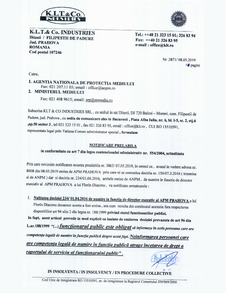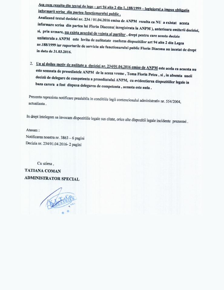 Ramane un mister insa cine a emis si semnat acesta decizie fara a exista o informarea scrisa din partea lui Florin Diaconu. Cat despre semnatura, acesta sigur nu este a lui Toma Florin Petcu, presedintele ANPM de la aceea vreme, daca comparam cu semnatura din decizia nr. 156/07.03.2016.