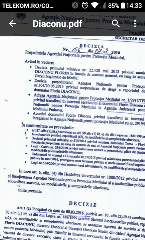 Astfel, desi art 94 alin 2 din L.188/1999 stipuleaza in mod explicit obligatia de informare in scris a persoanei care are competenta legala de numire cu privire la incetarea suspendarii in caz contrar inceteaza de drept raporturile de serviciu ale functionarului public …. Florin Diaconu este mai presus de lege. Fara a exista informare scrisa despre care vorbeam mai sus acesta este repus in functie prin decizia nr. 234/01.04.2016 ANPM .