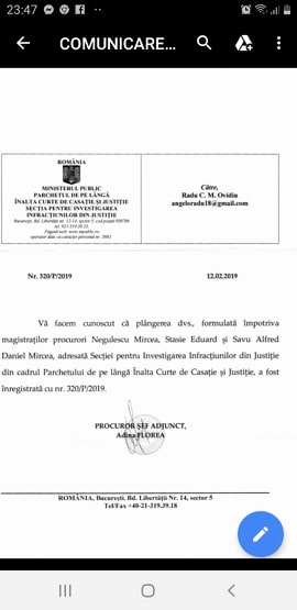 Astfel, la sfarsitul lunii ianuarie 2019, aprope dupa trei ani de la inscenare, in baza marturiilor din dosarul din instanta si a probelor administrate, directorul ziarului Incisiv de Prahova a depus plangere penala impotriva procuroilor Negulescu Mircea, Stasie Eduard si Savu Alfred Daniel Mircea, plangere adresata Sectiei pentru Investigarea Infracfiunilor din Justifie. Intre timp, aflam pe surse ca numarul procurorilor si judecatorilor din aceasta gasca de crima organizata s-a marit (un procuror de la DIICOT ST Ploiesti, altul de la Parchetul de pe langa Tribunalul Prahova si cativa judecatori).