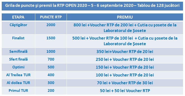 Toţi cei 128 de jucători participanţi la primul Grand Slam, vor primi premii în bani, puncte RTP şi voucher RTP.