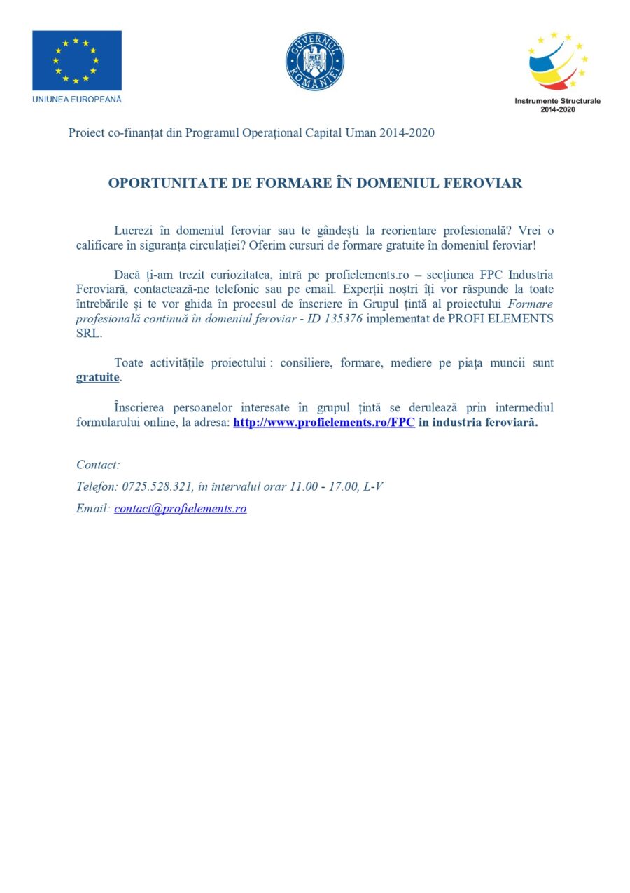 OPORTUNITATE DE FORMARE ÎN DOMENIUL FEROVIAR