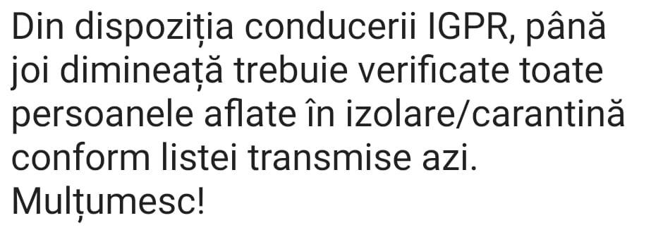 Așadar, motivul pentru care o astfel de activitate nu este procedurată la acest moment la nivelul Poliției Române, este reprezentat de faptul că instituția, conform legii de organizare și funcționare, nu are atribuții referitoare la verificarea persoanelor carantinate.