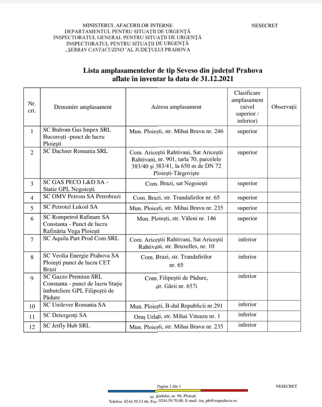 Mai mult, jos aveti si lista amplasamentelor de tip Sveso din judetul Prahova aflate in inventar la data de 31.12.2021:
