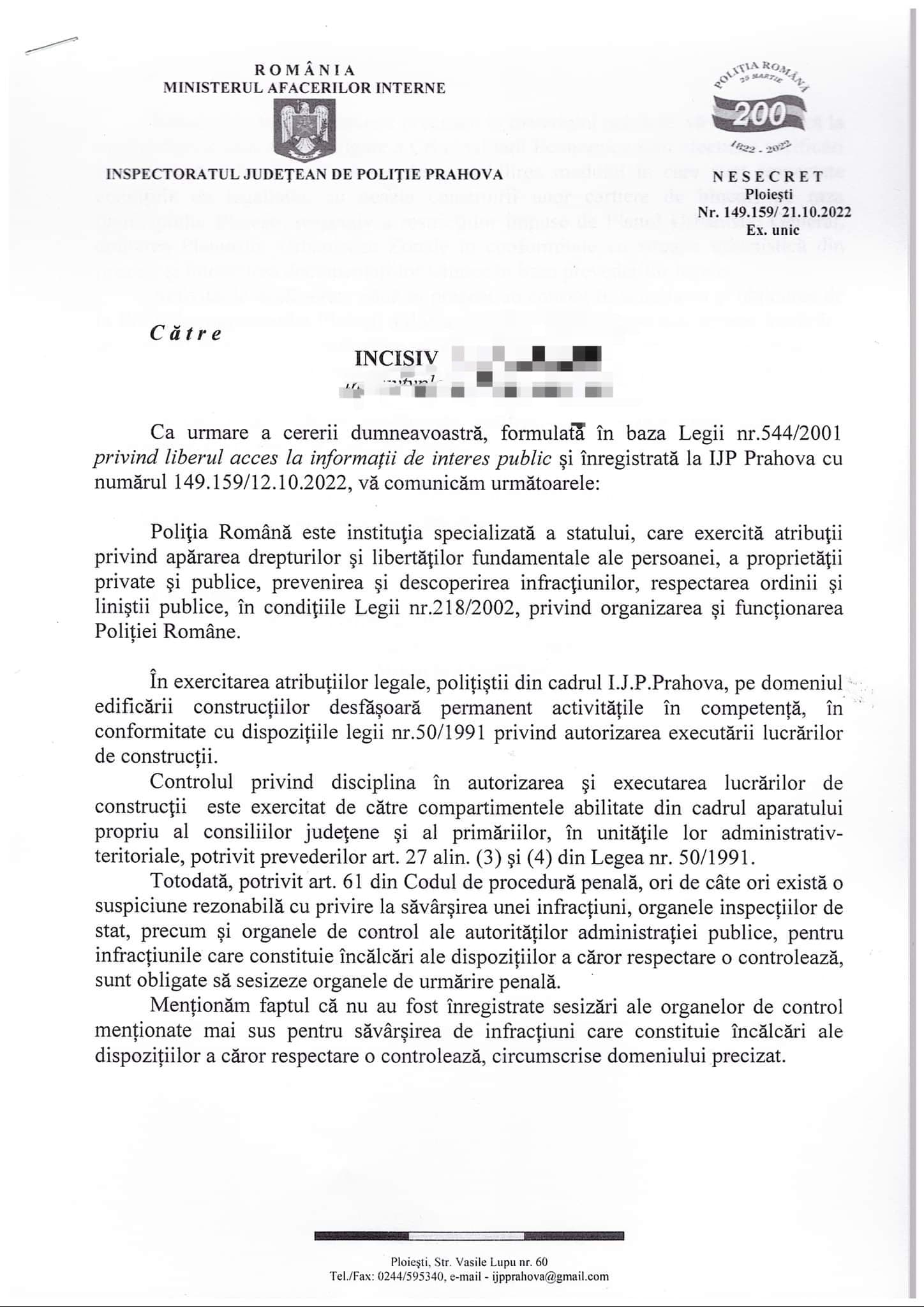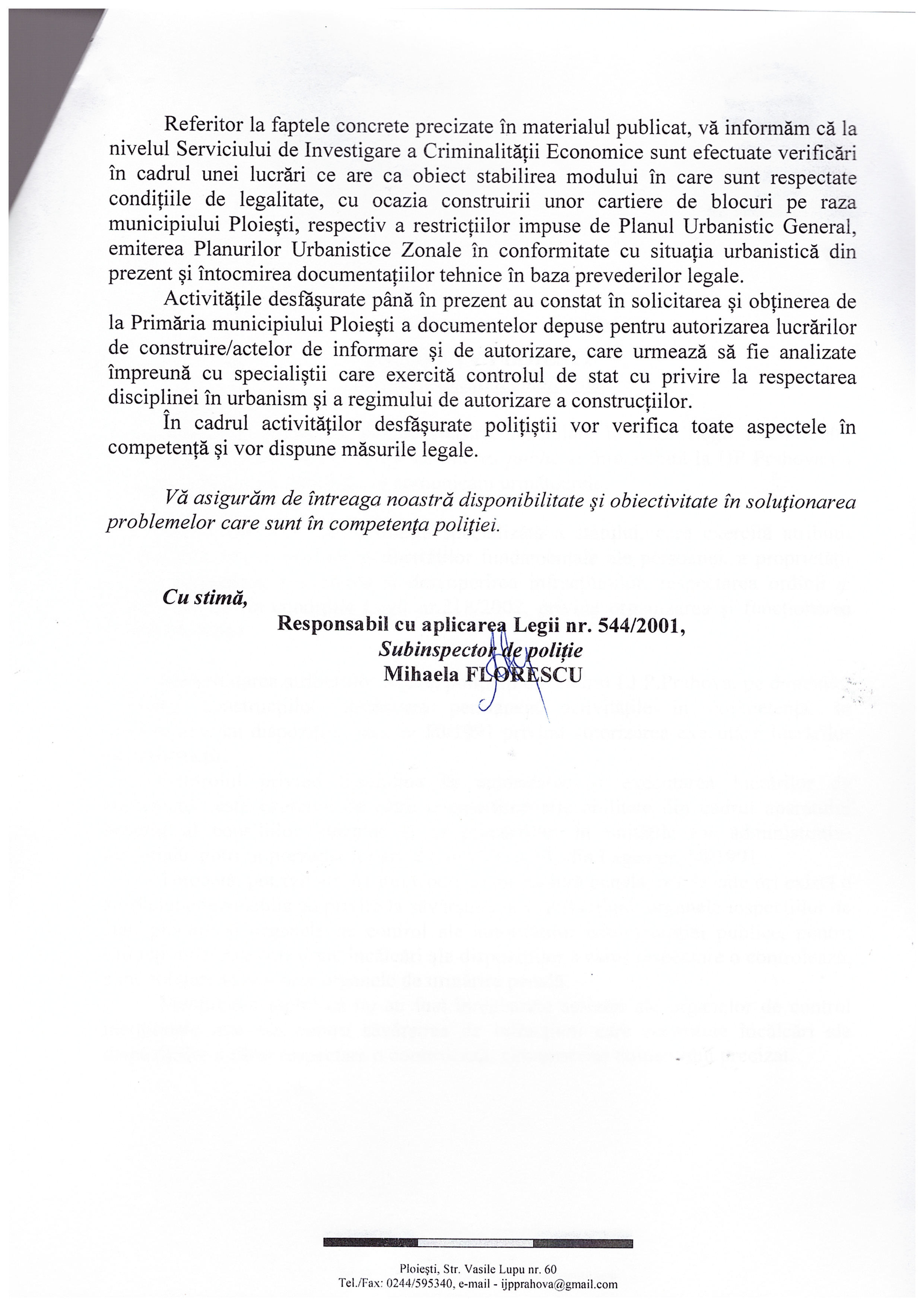 Va dezvaluiam ca, IPJ Prahova ne-a raspuns ca cei de la Serviciul de Investigare a Criminalitatii Economice au efectuat cercetari constand doar in solicitarea si obtinerea de la Primaria municipiului Ploiesti a documentelor depuse pentru autoriozarea lucrarilor de construire.